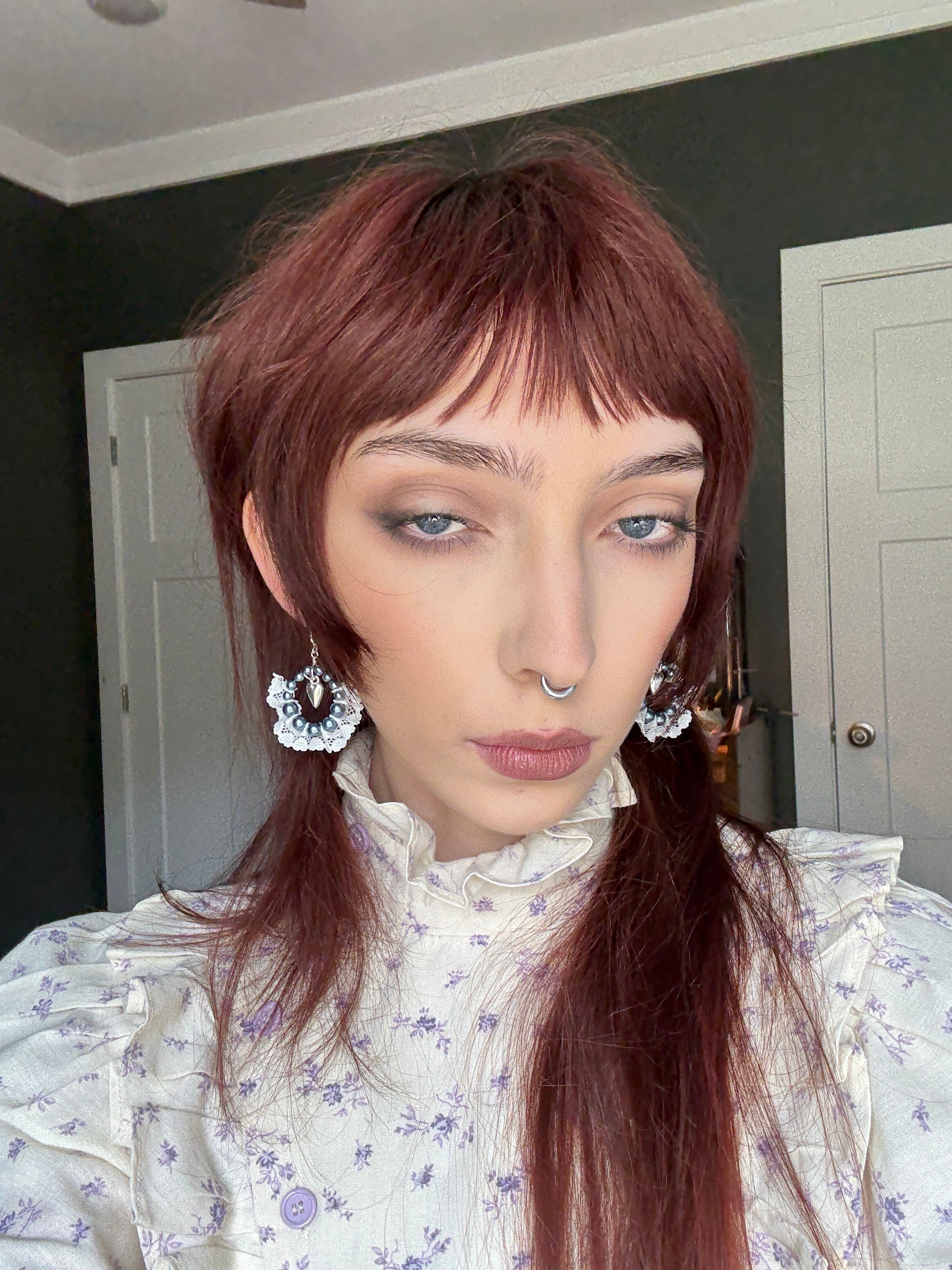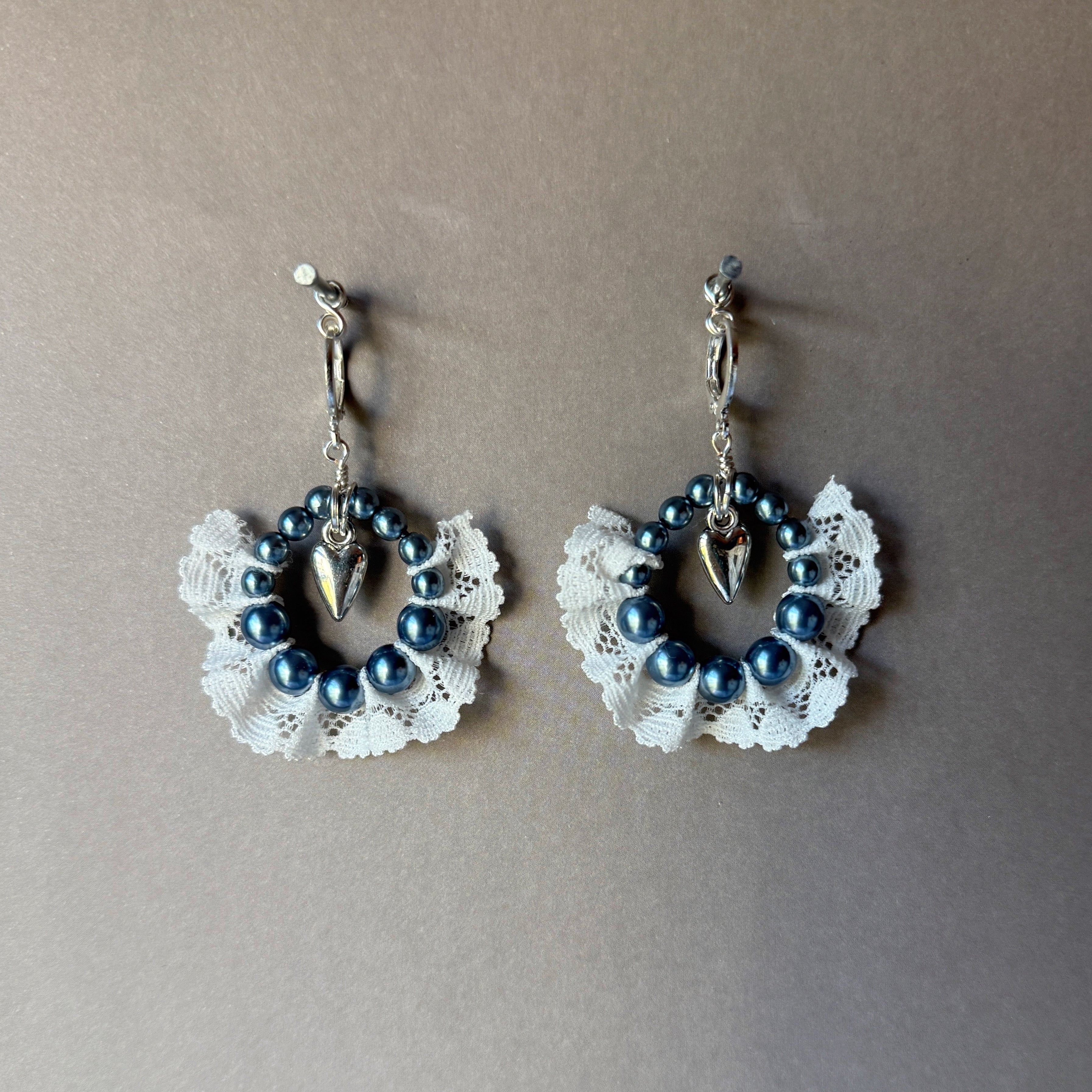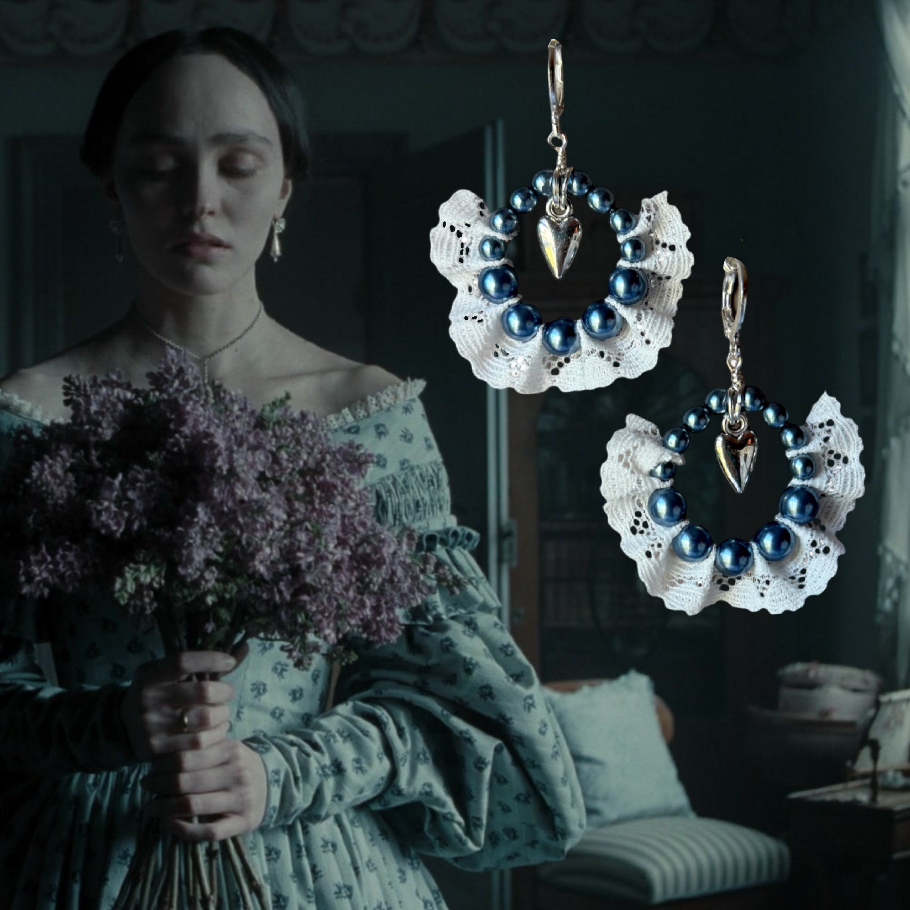 Made with glass pearl beads and lace. Inspired by Ellen’s dress and locket.